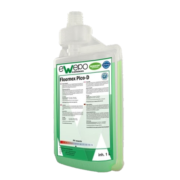 Ewepo Floornex Pico-D Vloerreiniger 6 x 1 liter is een laagschuimende vloerreiniger, speciaal ontwikkeld voor dagelijks gebruik op harde vloeren. Deze krachtige reiniger is veilig te gebruiken op diverse soorten vloeren en bouwt geen residuen op, waardoor de vloer na gebruik geen plakkerig of vettig gevoel achterlaat.