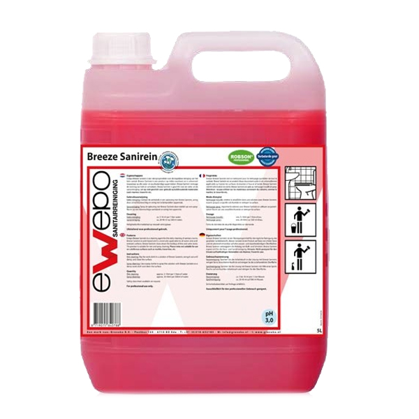 Ewepo Breeze Sanireiniger is een reinigingsmiddel voor de dagelijkse reiniging van het hele santair. Breeze Sanireiniger is een product op milde zuurbasis en is universeel toepasbaar op alle water- en zuurbestendige oppervlakken.