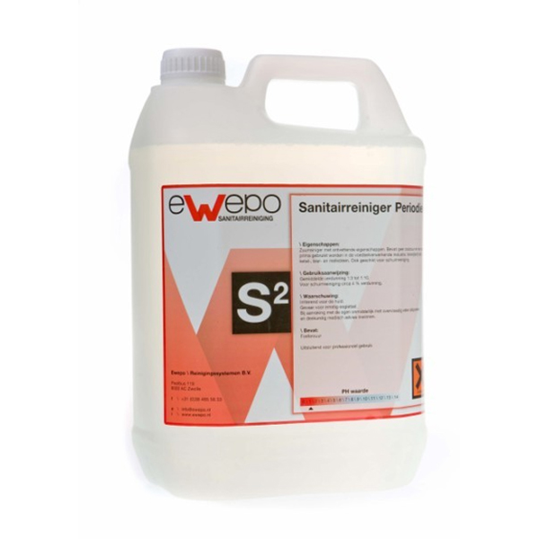 Ewepo Sanitairreiniger Periodiek is een zure reiniger met ontvettende eigenschappen. Sanitairreiniger Periodiek is geschikt voor het periodiek reinigen en ontkalken van sanitair, wasplaatsen, kleedkamers etc. Het product kan veilig worden toegepast op tegels, plavuizen, metaal, glas, glazuur, kunststoffen en zuurbestendige steensoorten. Sanitairreiniger Periodiek is tevens uitstekend in te zetten als aluminiumreiniger waarbij het vuil, vet en oxidatie verwijdert.