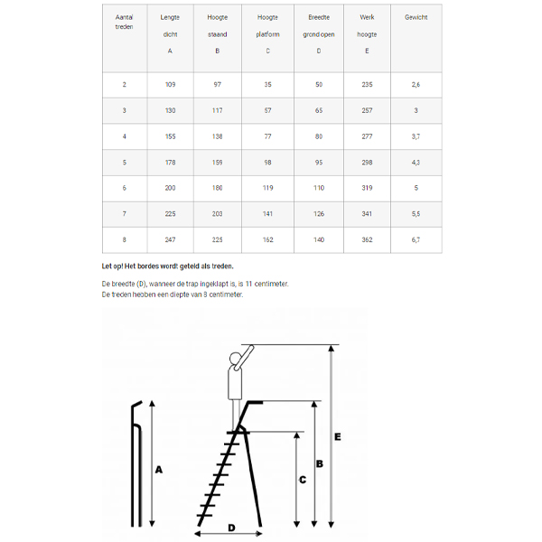 De trap is verkrijgbaar in de maten vanaf 2 treden t/m 8 treden.